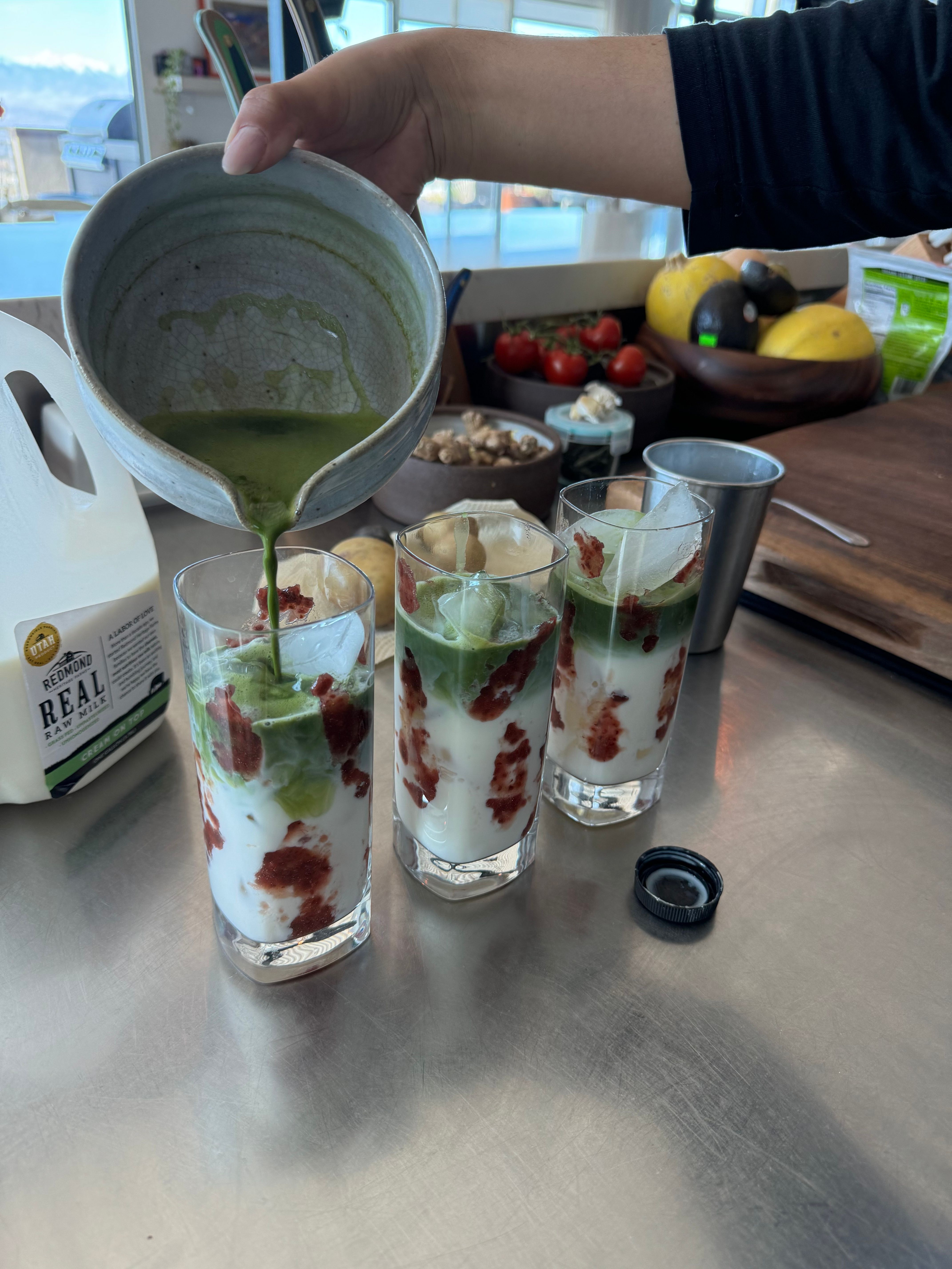 The raspberry jam creates a gorgeous swirl and adds a naturally sweet, slightly tart flavor that balances the grassy notes of matcha. Paired with creamy raw milk, it becomes a simple drink that feels special enough for a slow morning or a refreshing afternoon pick-me-up.